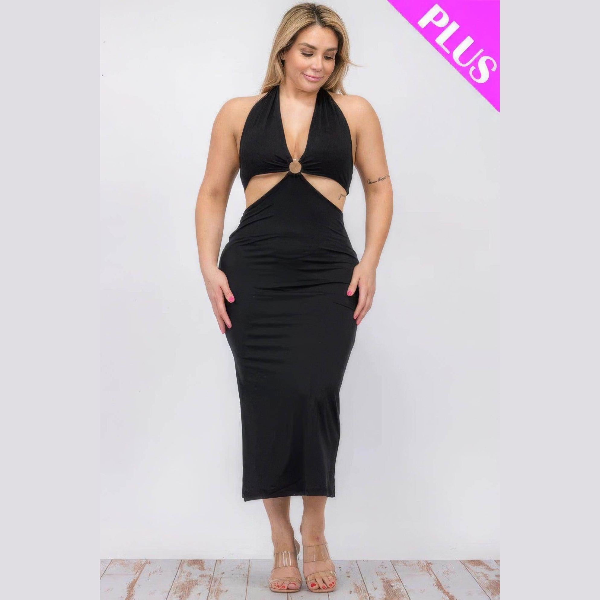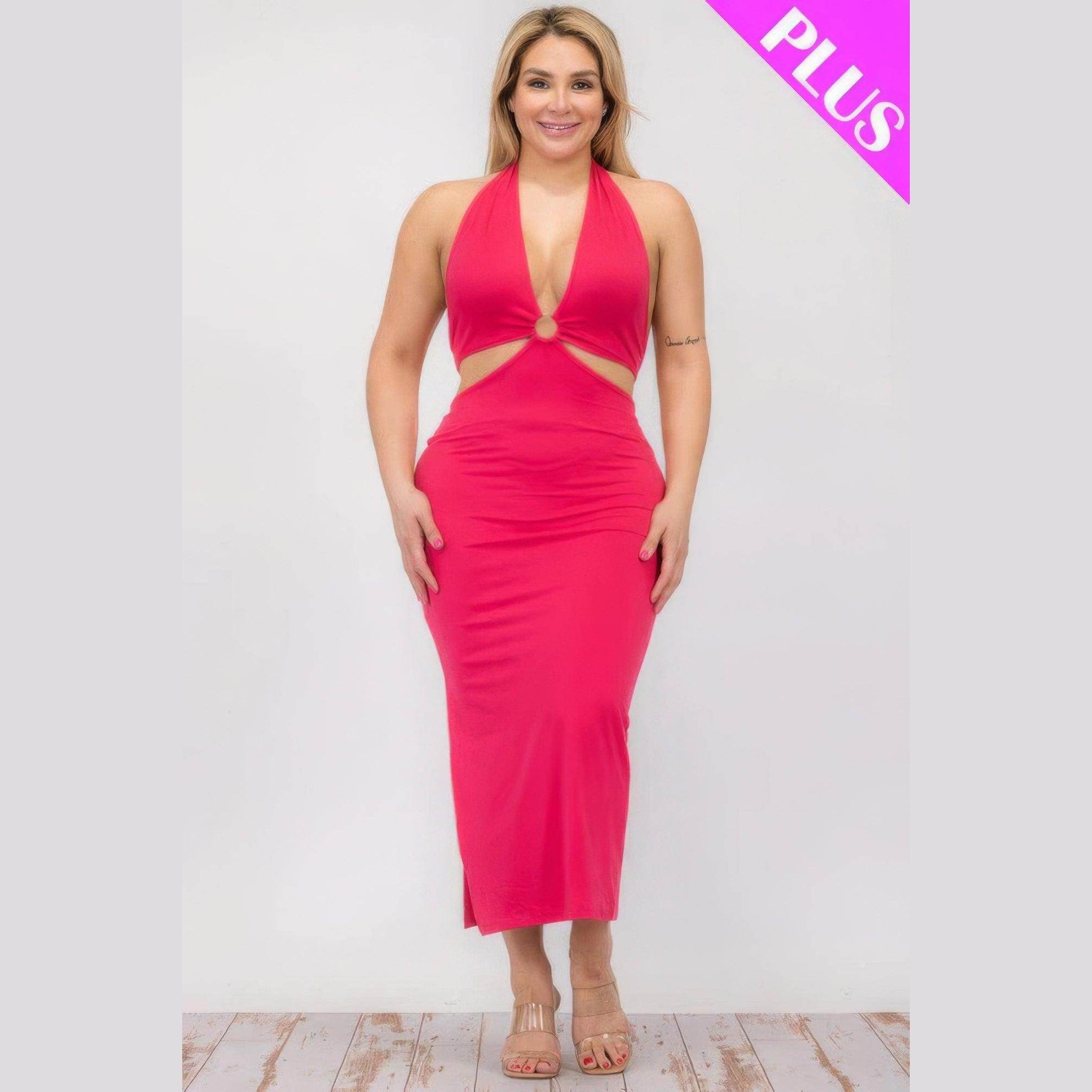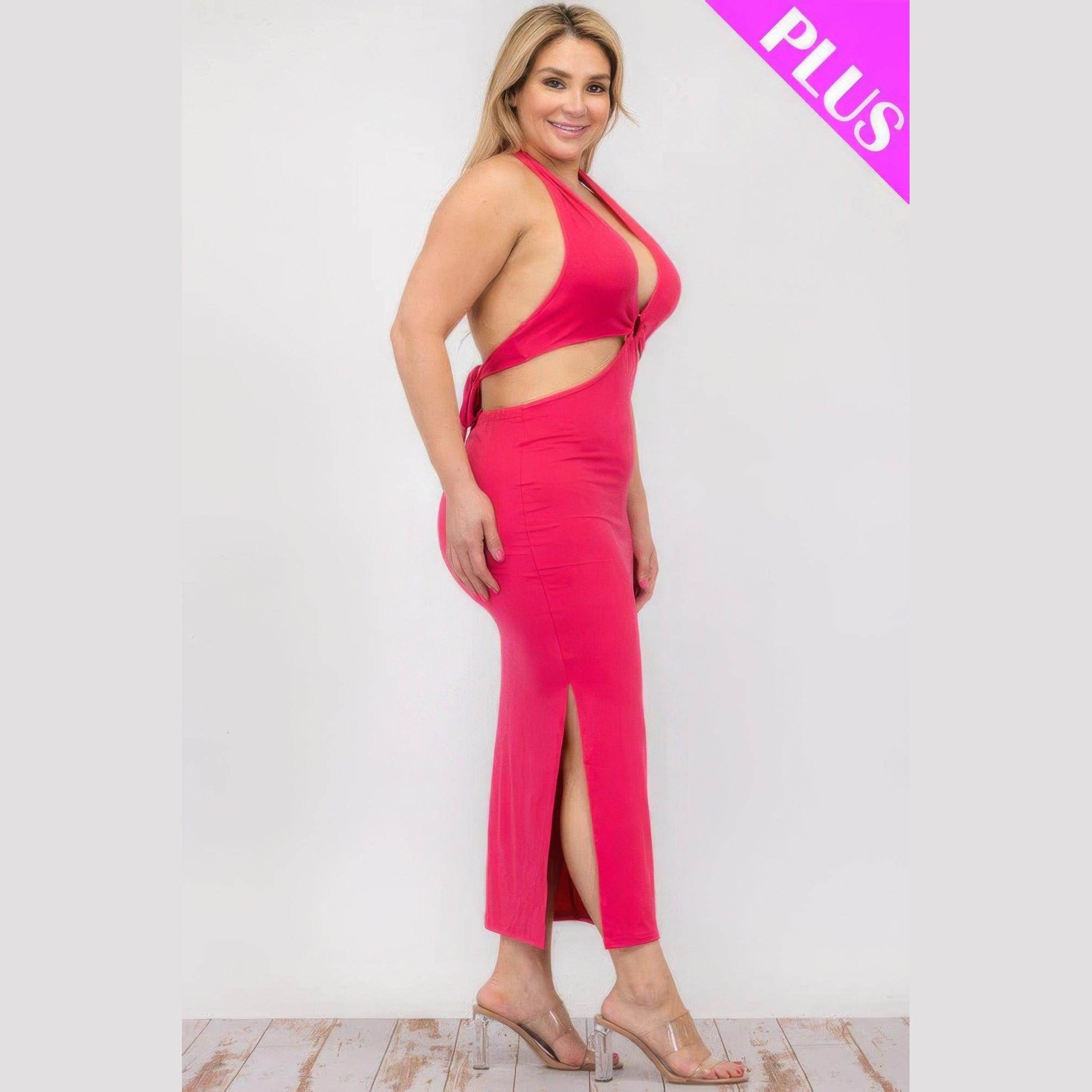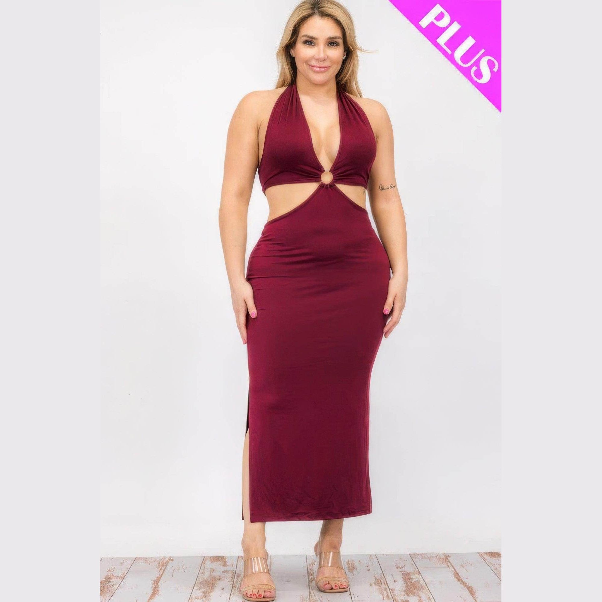 Learn more about our Plus Size Cut-out Halter Neck Back Tie Split Midi Dress at VacationGrabs: