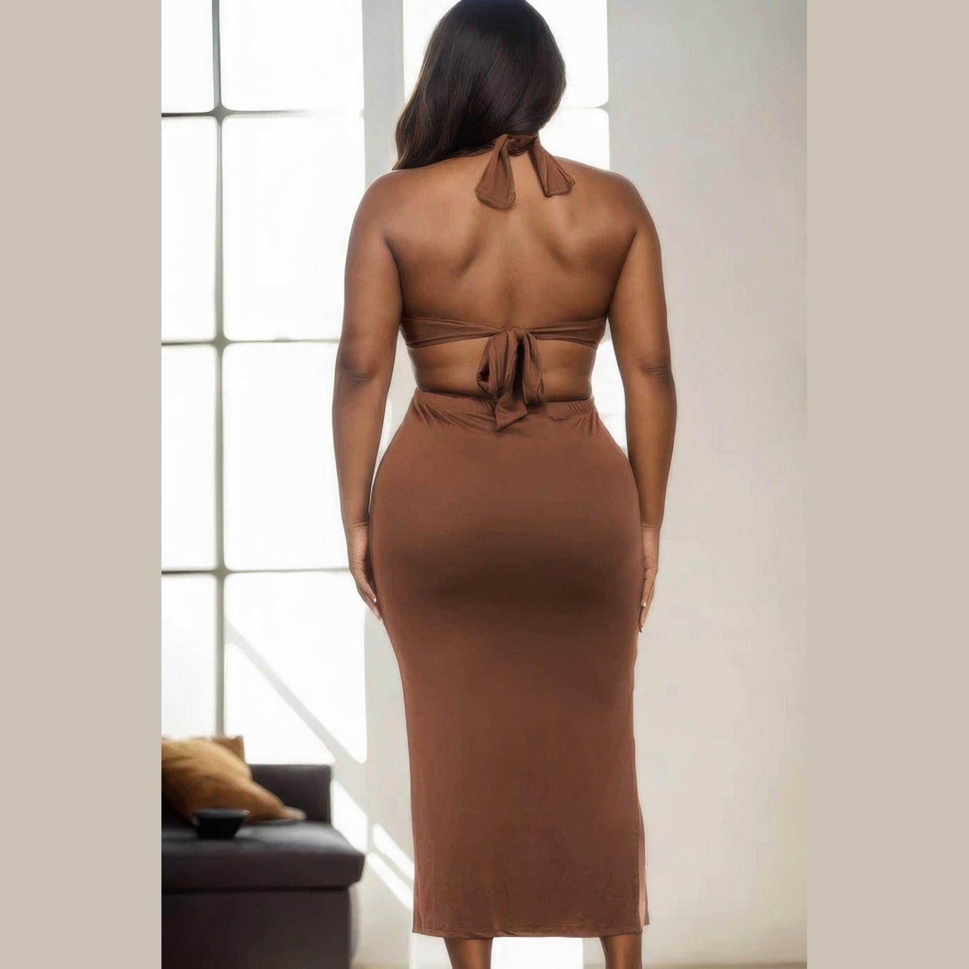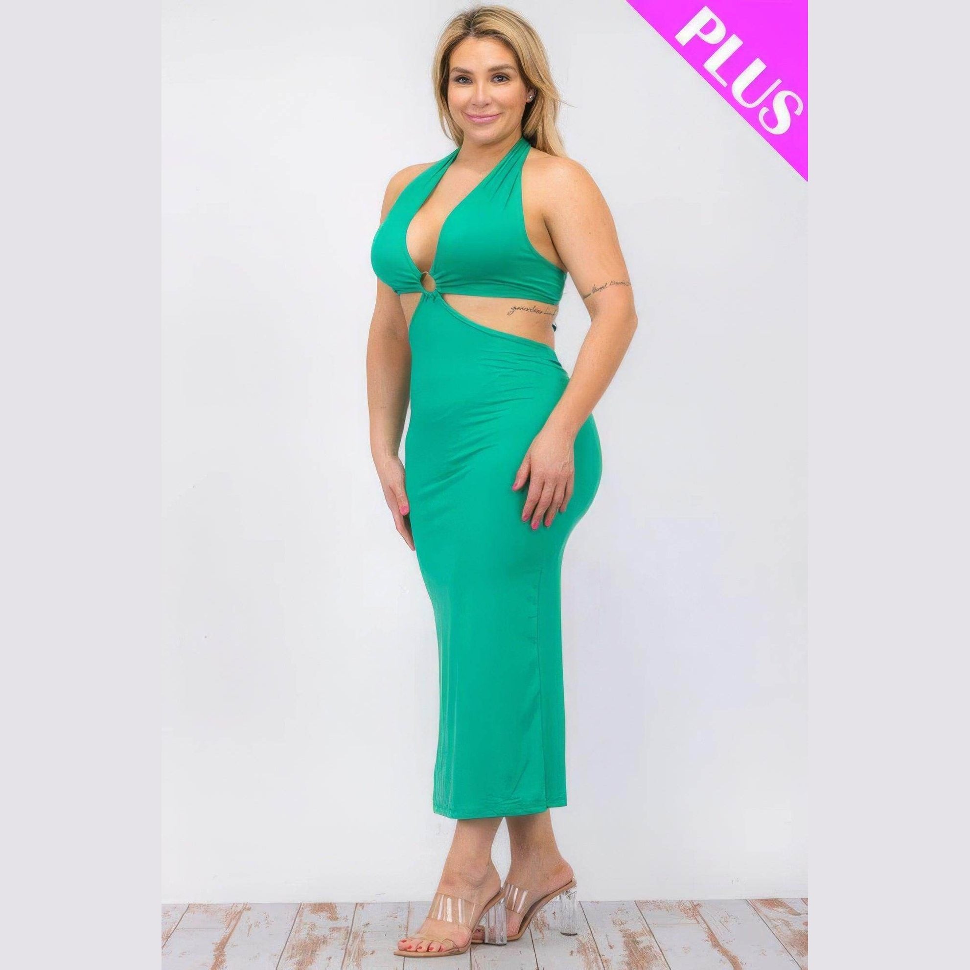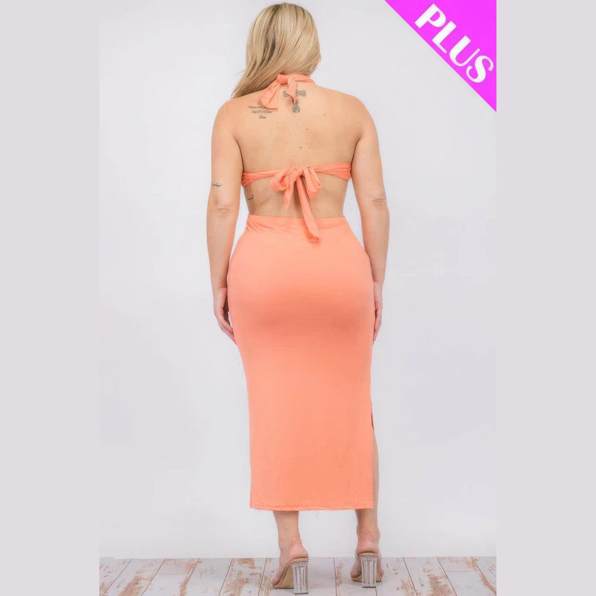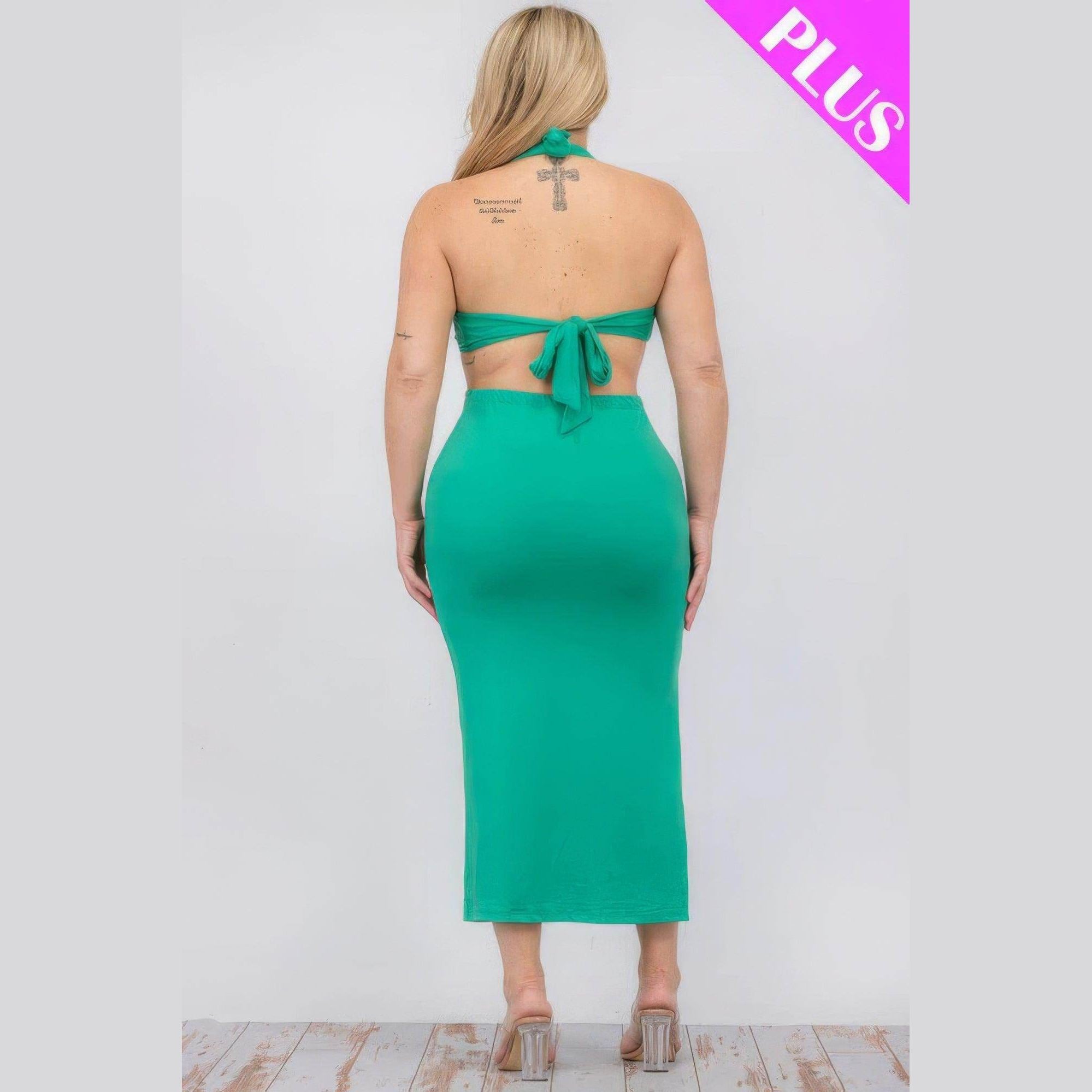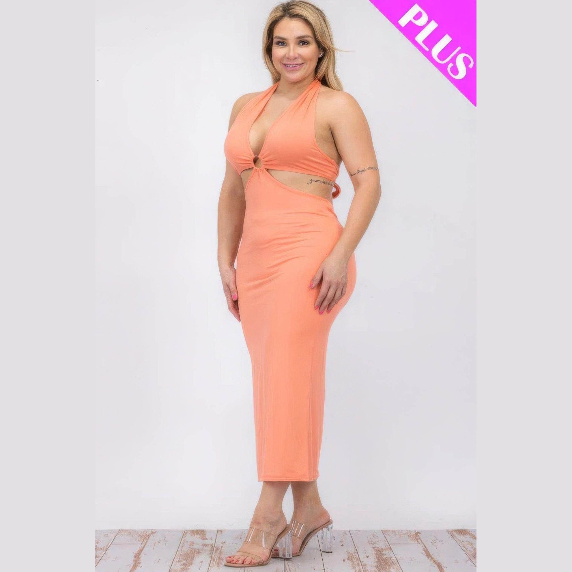 Learn more about our Plus Size Cut-out Halter Neck Back Tie Split Midi Dress at VacationGrabs: