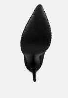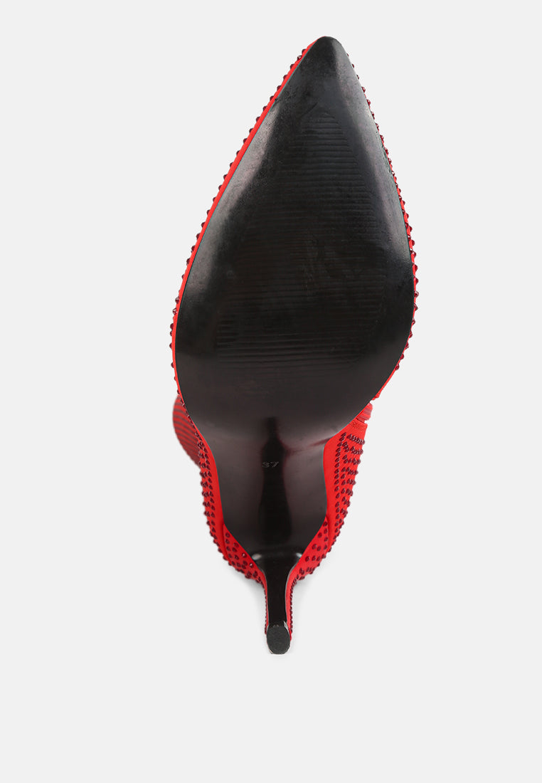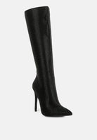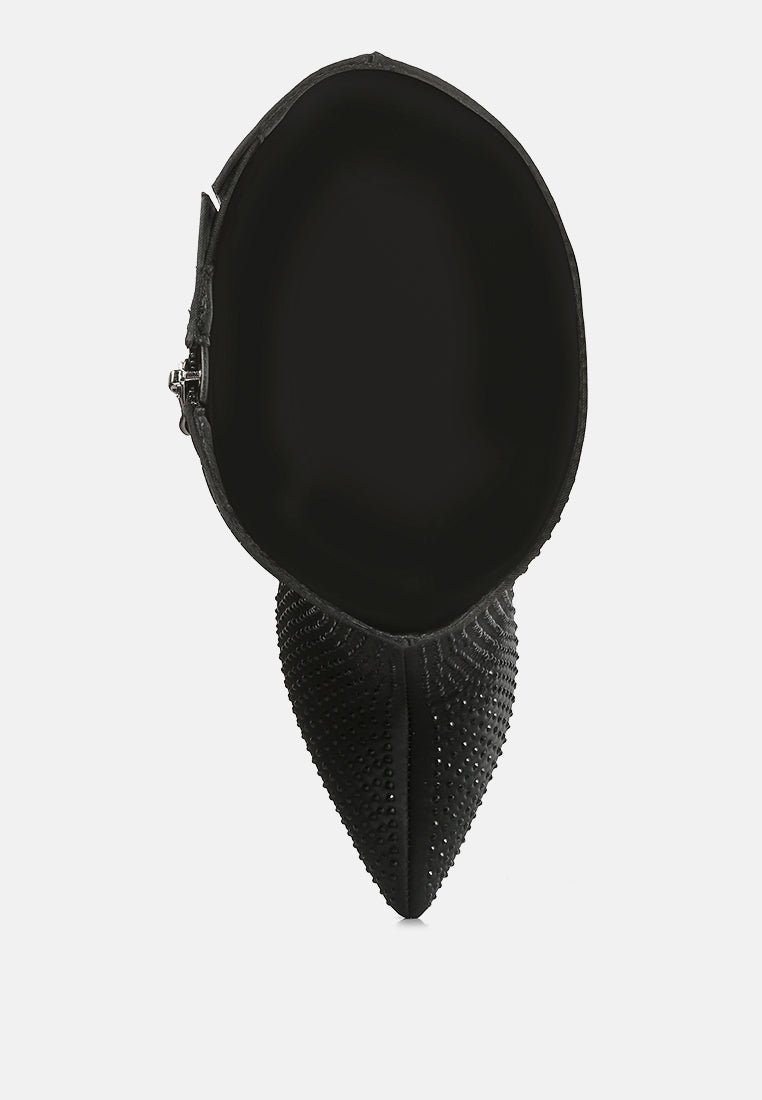 High Pointed heel boot with heat set diamante shines you through the party! It comes with an inside zipper opening which makes it easy to wear. The pointed heel and pointed toe in this calf boot make it chic!