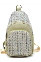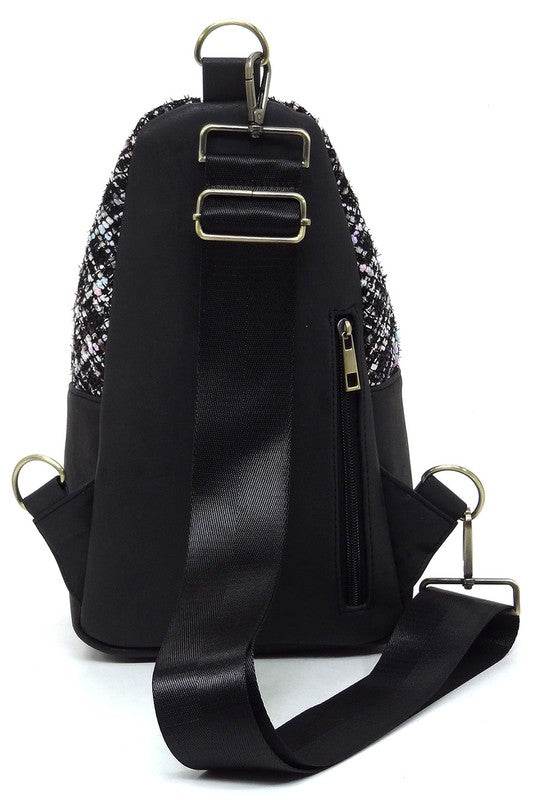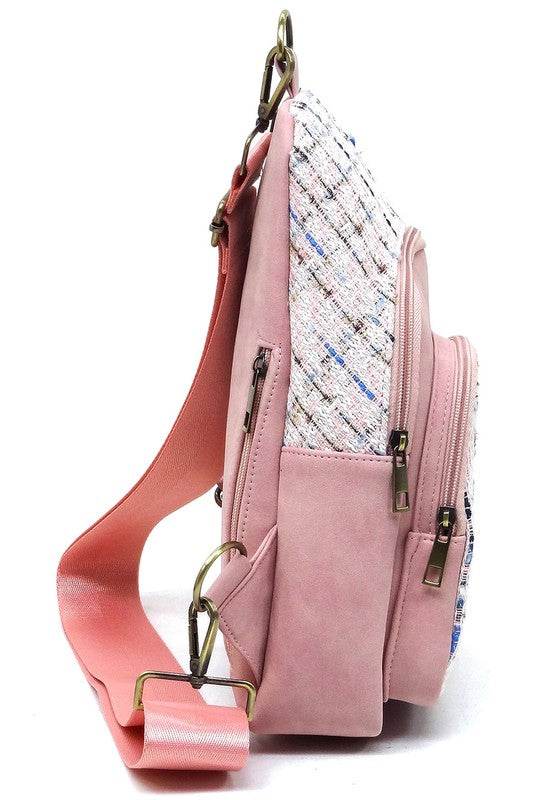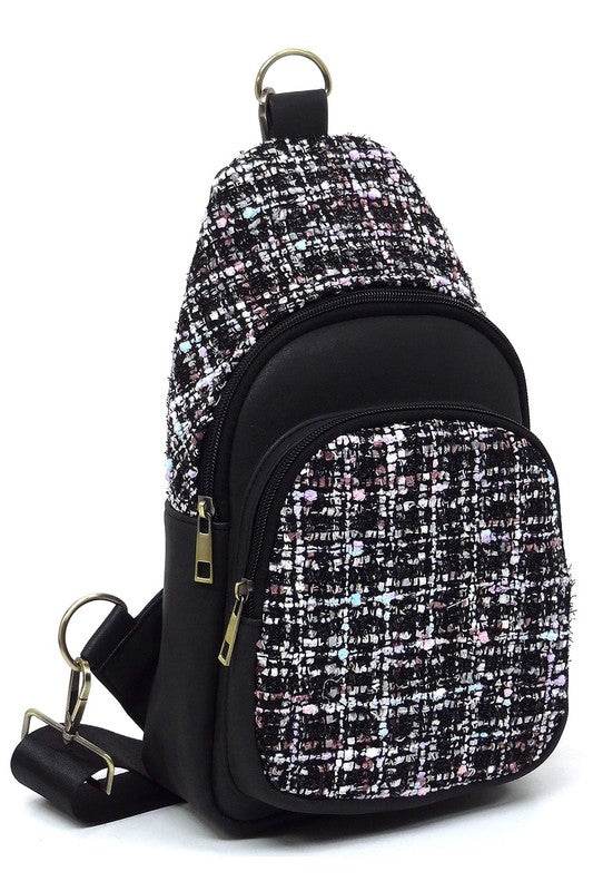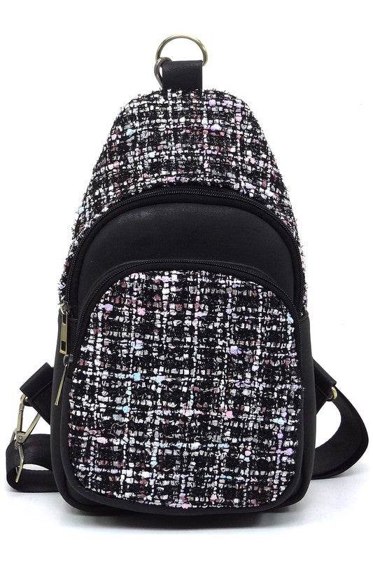 Indulge in luxury and style with our Tweed Sling Bag Backpack. Featuring trendy colorful tweed, this backpack is the perfect combination of fashion and function. Carry your essentials in an elegant and exclusive way with this sophisticated backpack that is sure to elevate your look.