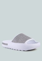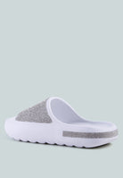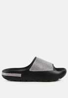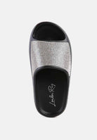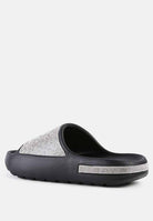 Molded insole and soft rubber platform slides; what catches attention is the shiny diamante details over the round-toe cute sliders. The funky casual slides are summer stunners from London Rag.