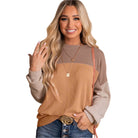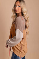Learn more about our Khaki Color Block Long Sleeve Ribbed Loose Top at VacationGrabs:
