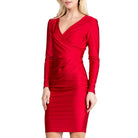 Long sleeve shiny tricot overlap midi dress.