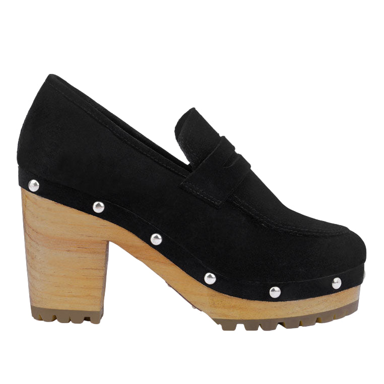 Handcrafted with fine soft suede leather, these heeled loafers is a chase! Stud lined detail on the rubber insole wooden clogs is all aesthetics. The organic cotton lining keeps feet at comfort and odour free, is comfortable and sets on feet curve just well!