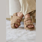 Enjoy modern stitching details and neutral tones. Wear them with dresses, shorts, or your favorite jeans. These shoes pair well with almost any vacation outfit. The double buckle slip on shoes are easy to match and quick to wear.