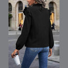 Crafted with care, the blouse features a mock neck that exudes refined charm. The ruffle shoulders add a playful twist, making it an ideal piece for both casual and dressy occasions. The breathable fabric ensures you stay comfortable throughout your journey, no matter the destination.