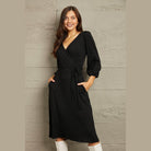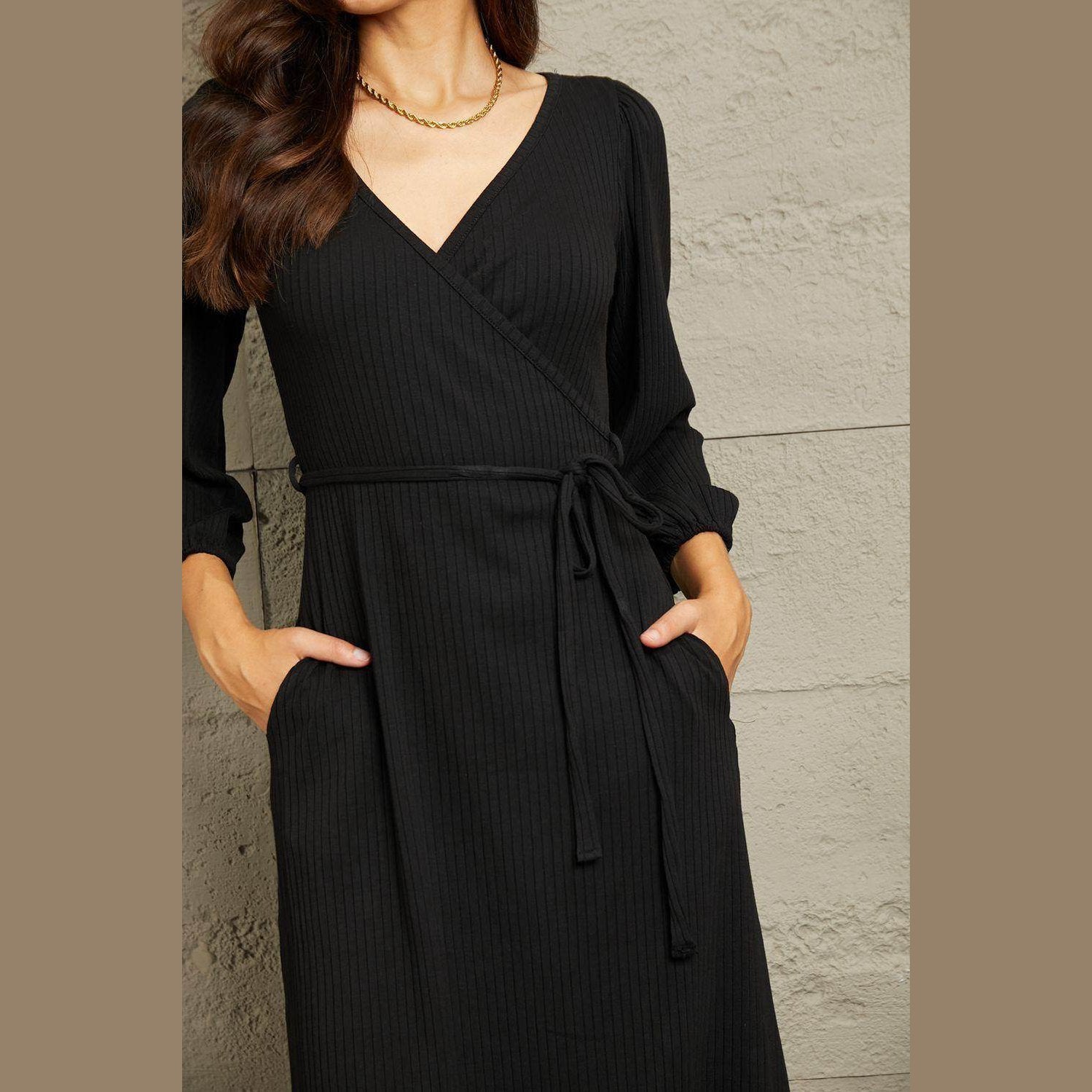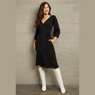 This versatile midi dress features a timeless wrap-style design that flatters every figure, while the waist tie enhances your silhouette for a confident and chic look. The ruching sleeve detail adds a touch of elegance to the long sleeves, making this dress perfect for both daytime and evening occasions.
