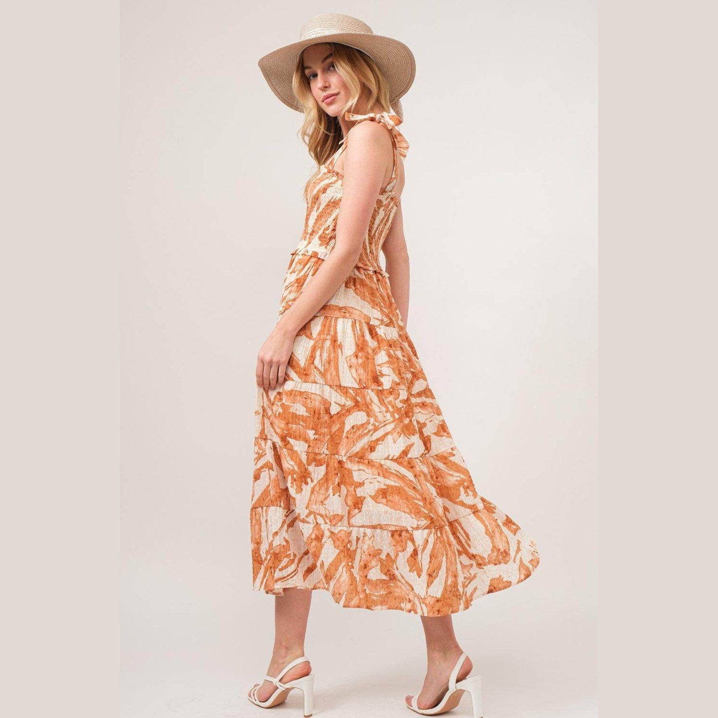 The tie shoulder smocked midi tiered dress is a charming and feminine choice for any summer occasion. With its delicate tie shoulder straps and smocked bodice, this dress offers a comfortable and flattering fit. The midi length and tiered skirt add a romantic touch, creating a flowy and elegant silhouette. Perfect for beach days, garden parties, or brunch outings, this dress exudes a relaxed yet stylish vibe. Embrace the carefree summer spirit in the tie shoulder smocked midi tiered dress for a fashionable and effortless look. Elevate your warm-weather wardrobe with this lovely dress that will keep you looking chic and feeling comfortable all season long.
