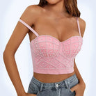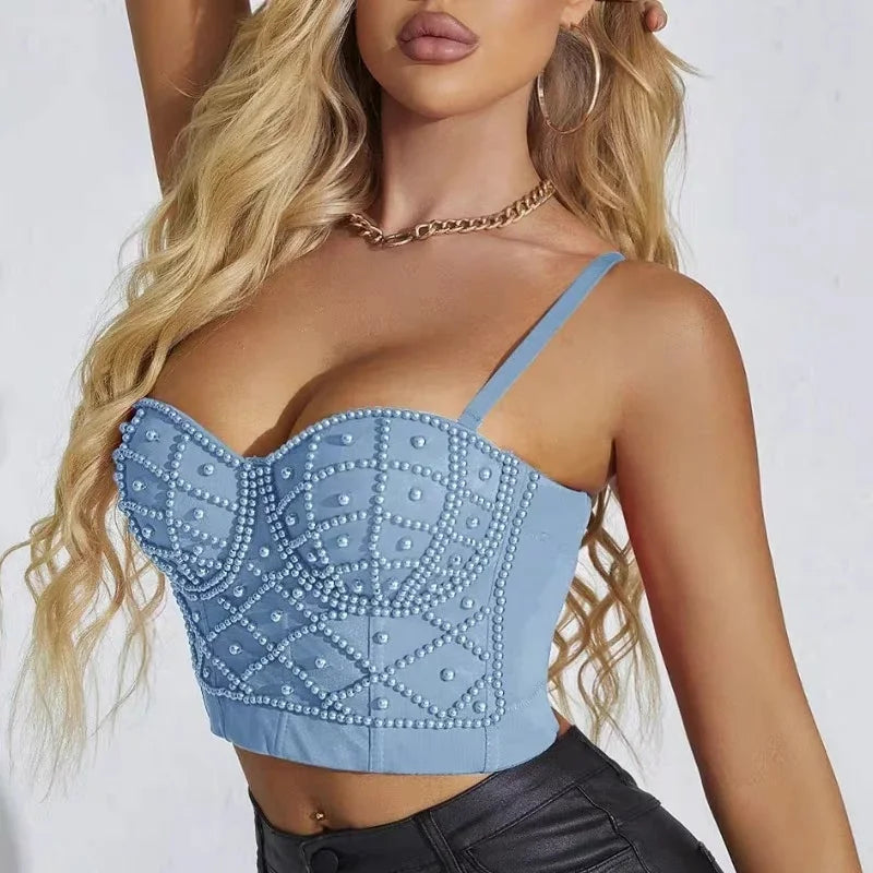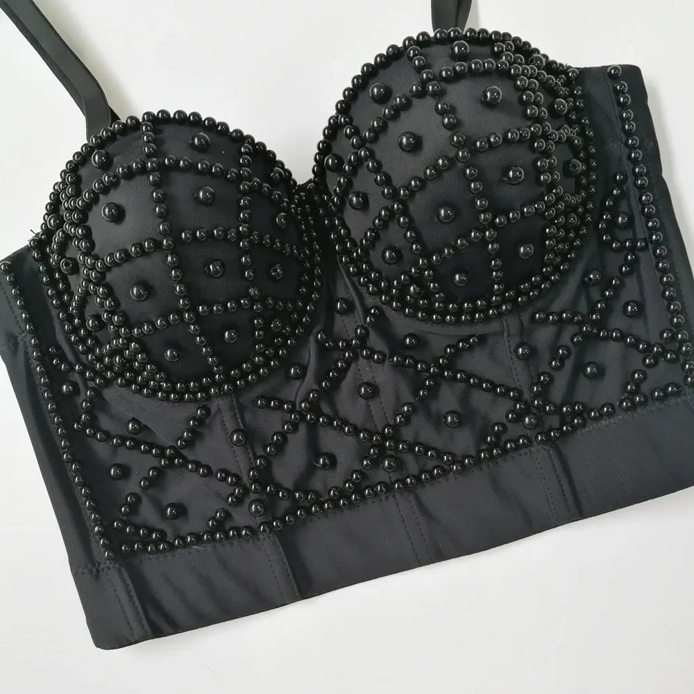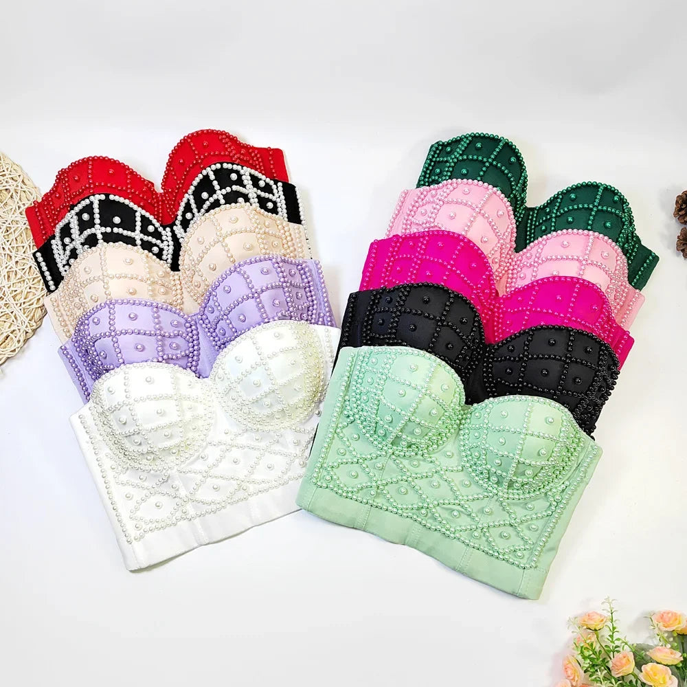 Turn heads at every summer club event with this Alluring strapless pearl bra top. Designed by VacationGrabs, this unique top offers style and comfort for your night out. Each pearl detail adds a special touch that stands out in the crowd.