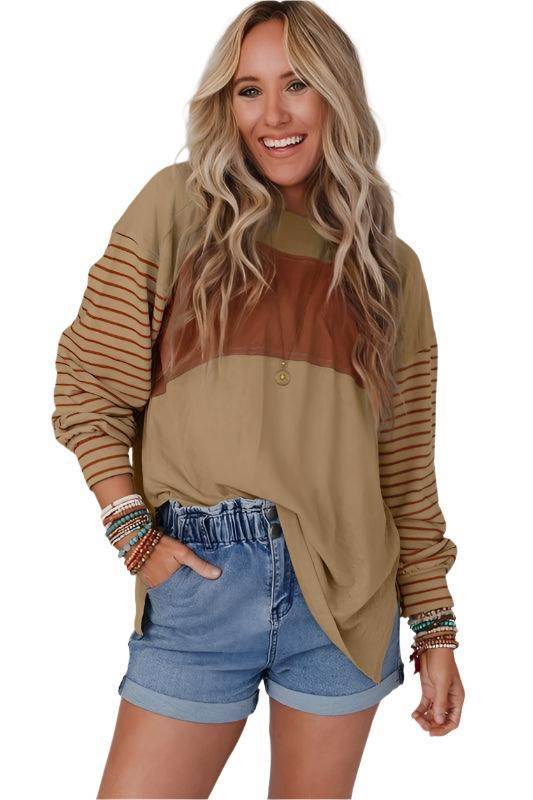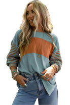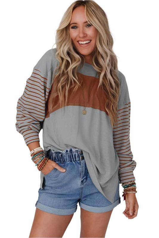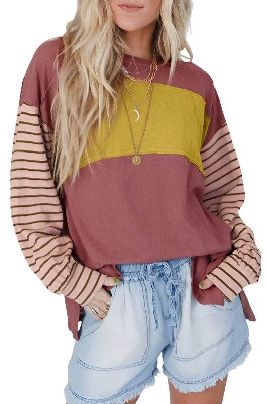 Learn more about our Color Block Stripe Lantern Sleeve Side Slit Tunic at VacationGrabs: