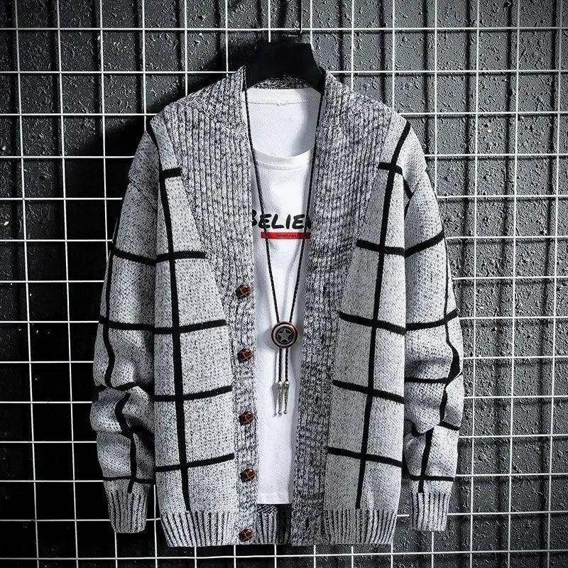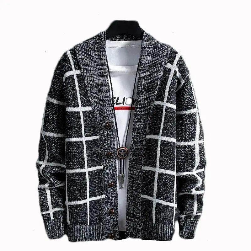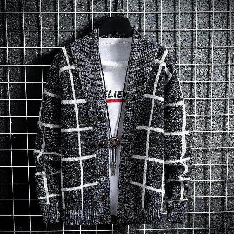 This Mens Shawl Collar Gray Black Grid Cardigan Sweater is an affordable and travel friendly clothing piece that is made from premium quality material. Its shawl collar and grid pattern make it stylish and elegant. Perfect for every occasion.