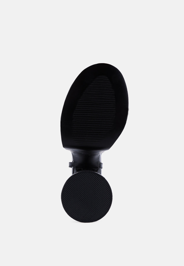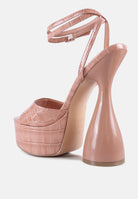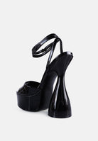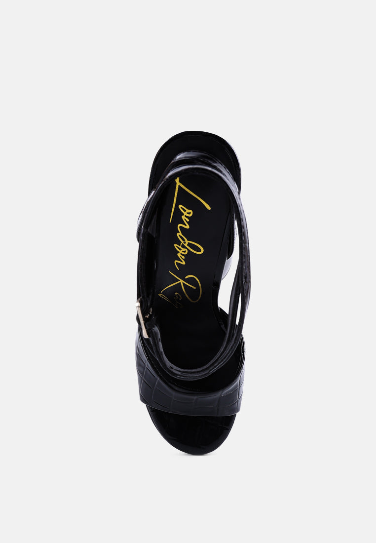 Ultra high-heeled croc print patent PU sandals have the right oomph to set summer ablaze. Comes with wrap-around ankle lace with pin-buckle fastening. The lightly padded insole and slingback offers comfort.