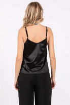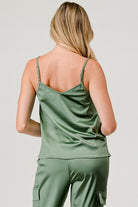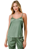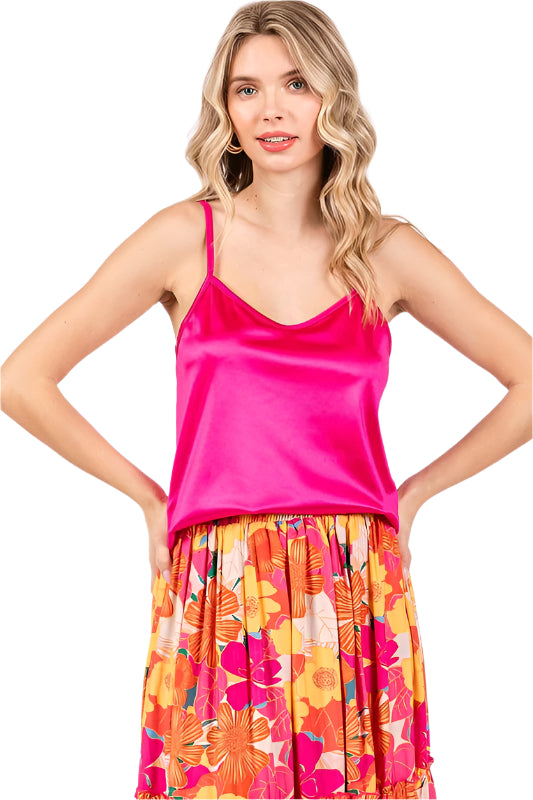 regular size, standard, young contemporary, contemporary, satin, solid color, casual top, tank top, blouse, top, adjustable straps, low back, v-neck, sleeveless, trendy, chic, stylish, fashionable, simple, comfortable, daily wear, loungewear. spring, summer, ss, women's clothing, women's apparel, women's wear