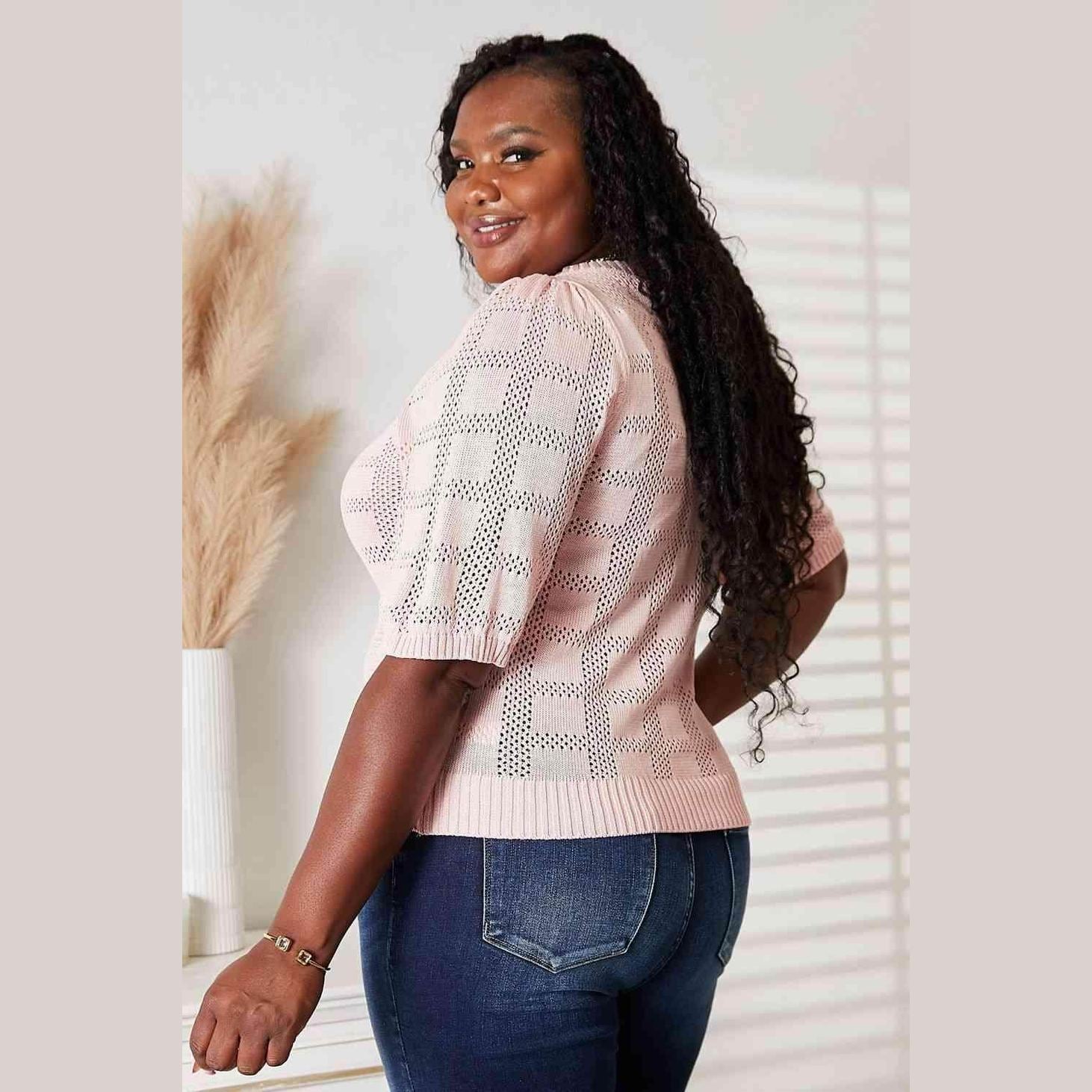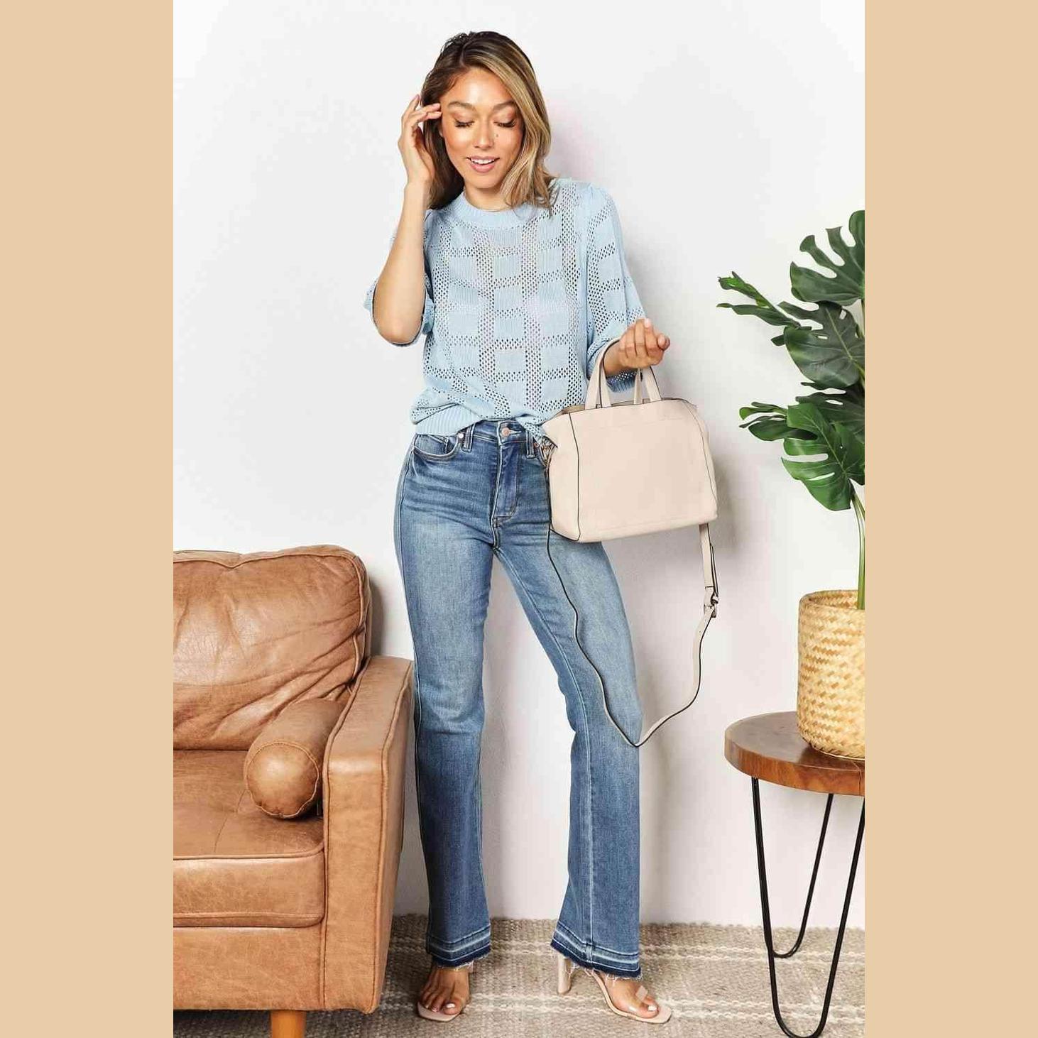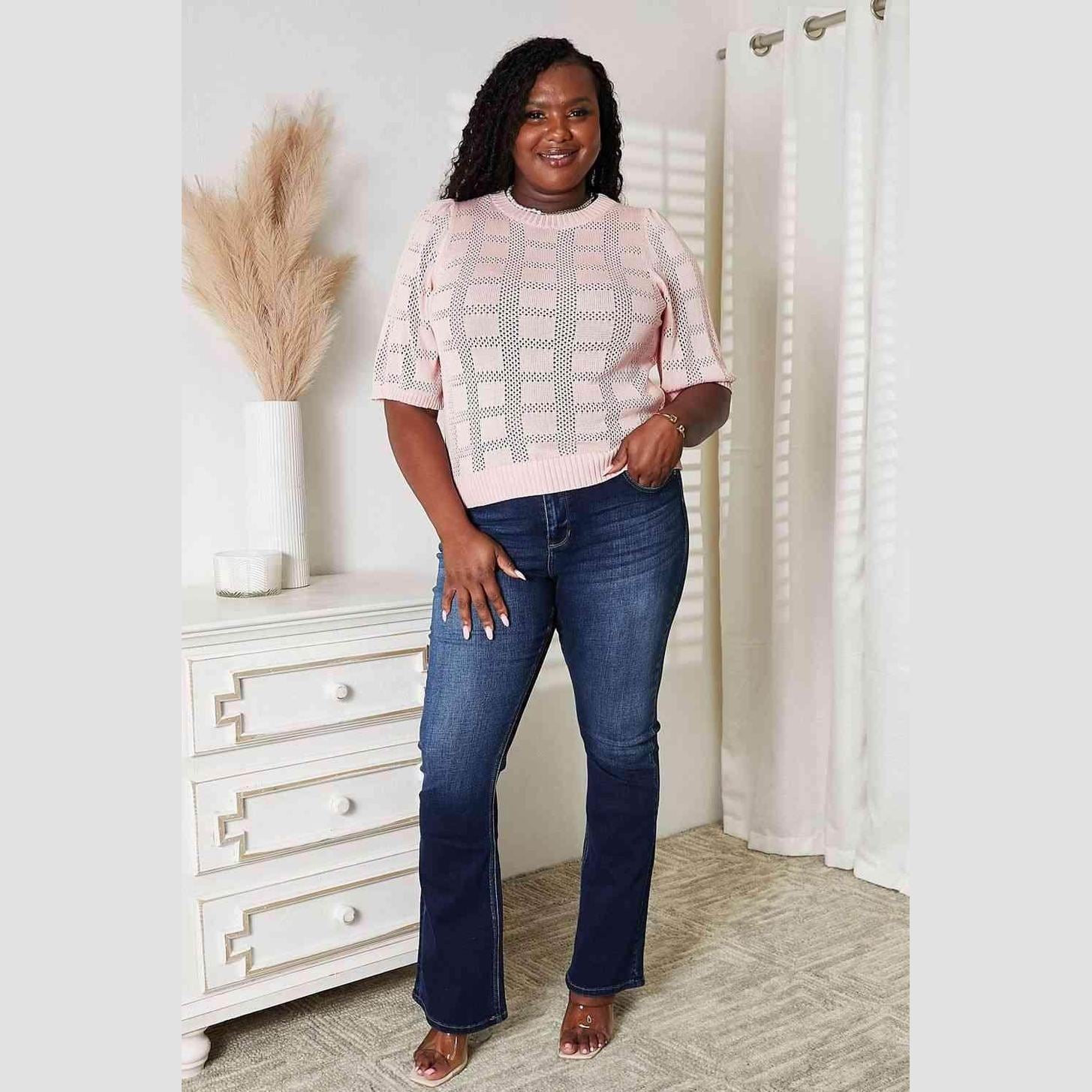 The ribbed trim adds a touch of sophistication, enhancing its overall appeal. This round neck knit top is a versatile piece, perfect for layering or wearing solo. Whether you're heading to a casual outing or a get-together, this top keeps you looking chic.