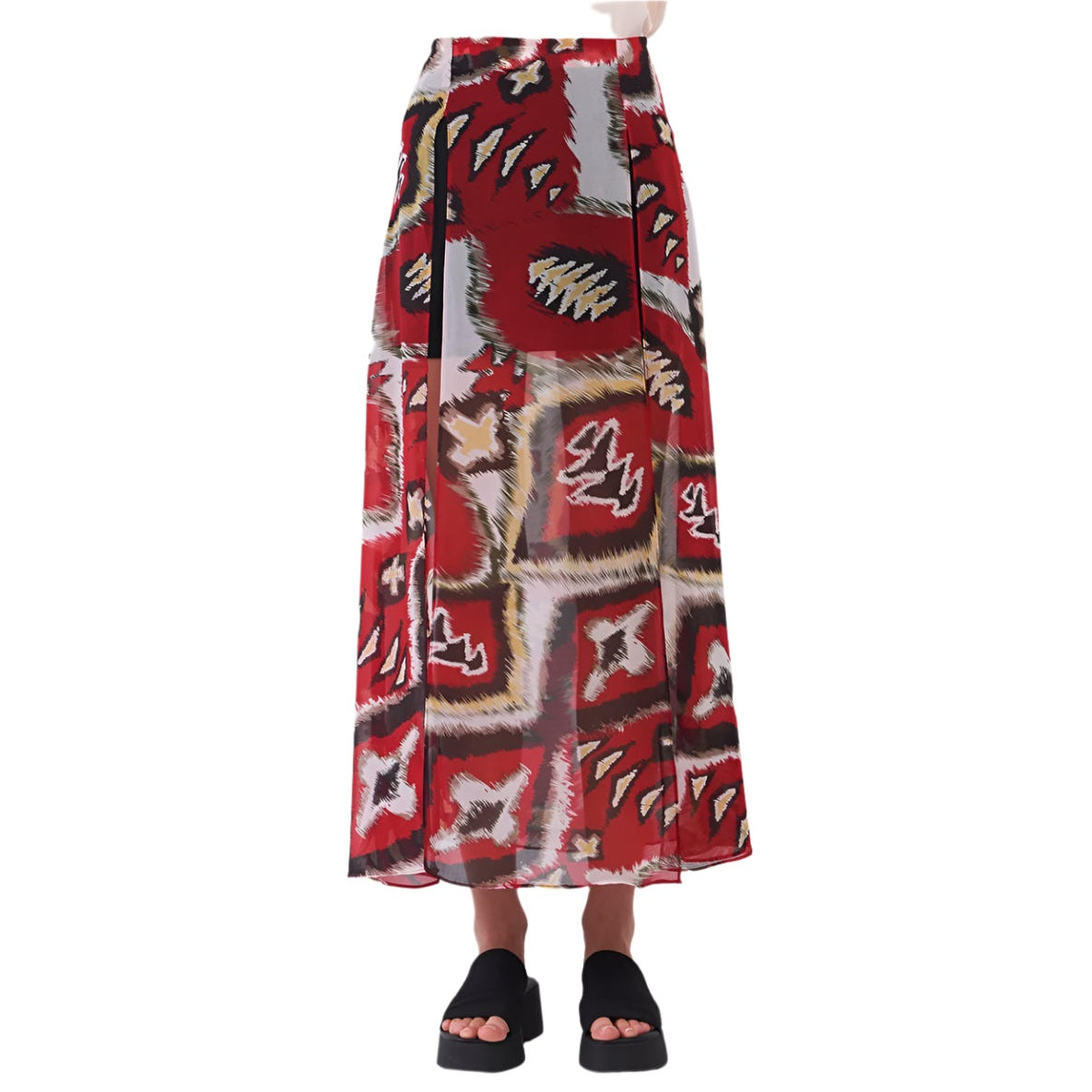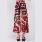 Explore new styles with this boho vacation skirt for women. The skirt offers a bold design with red and multi vintage graphic print. The high-waisted fit makes it flattering for many body shapes. Two front slits add movement and comfort to every step.