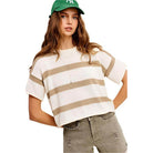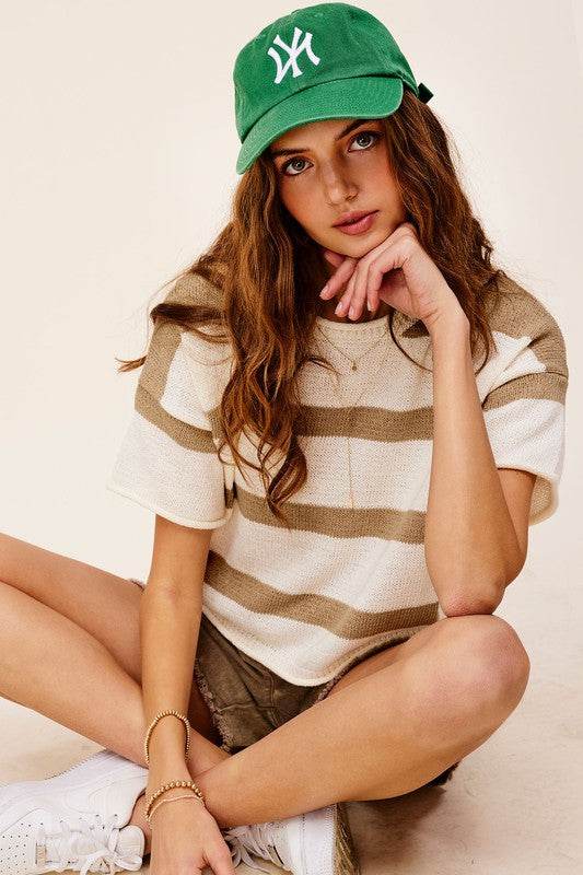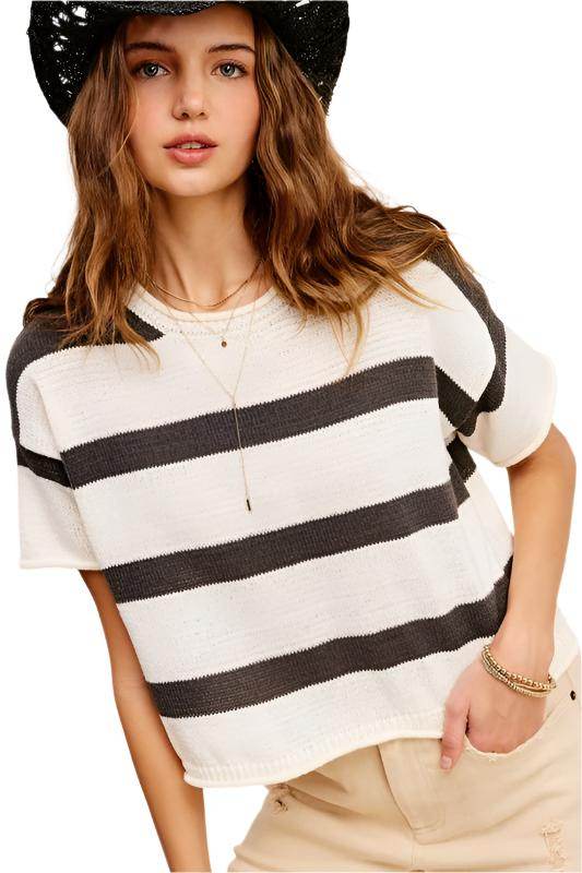 The Lightweight Stripe Sweater Short Sleeve Top is the perfect blend of comfort and style. Crafted from a soft, lightweight fabric, this top features a classic stripe pattern that adds a timeless appeal to your wardrobe.