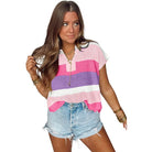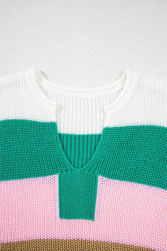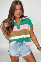 Add a pop of color to your getaway with the Multicolour Color Block V Neck Sweater from YNIQUE at VacationGrabs. This piece is the perfect lightweight striped sweater for travel. Bright green, blush pink, classic white, and tan stripes create a fresh look. The V neckline adds modern style. The short sleeves keep it breezy. Enjoy soft knit fabric that is ideal for warm days and cool evenings.
