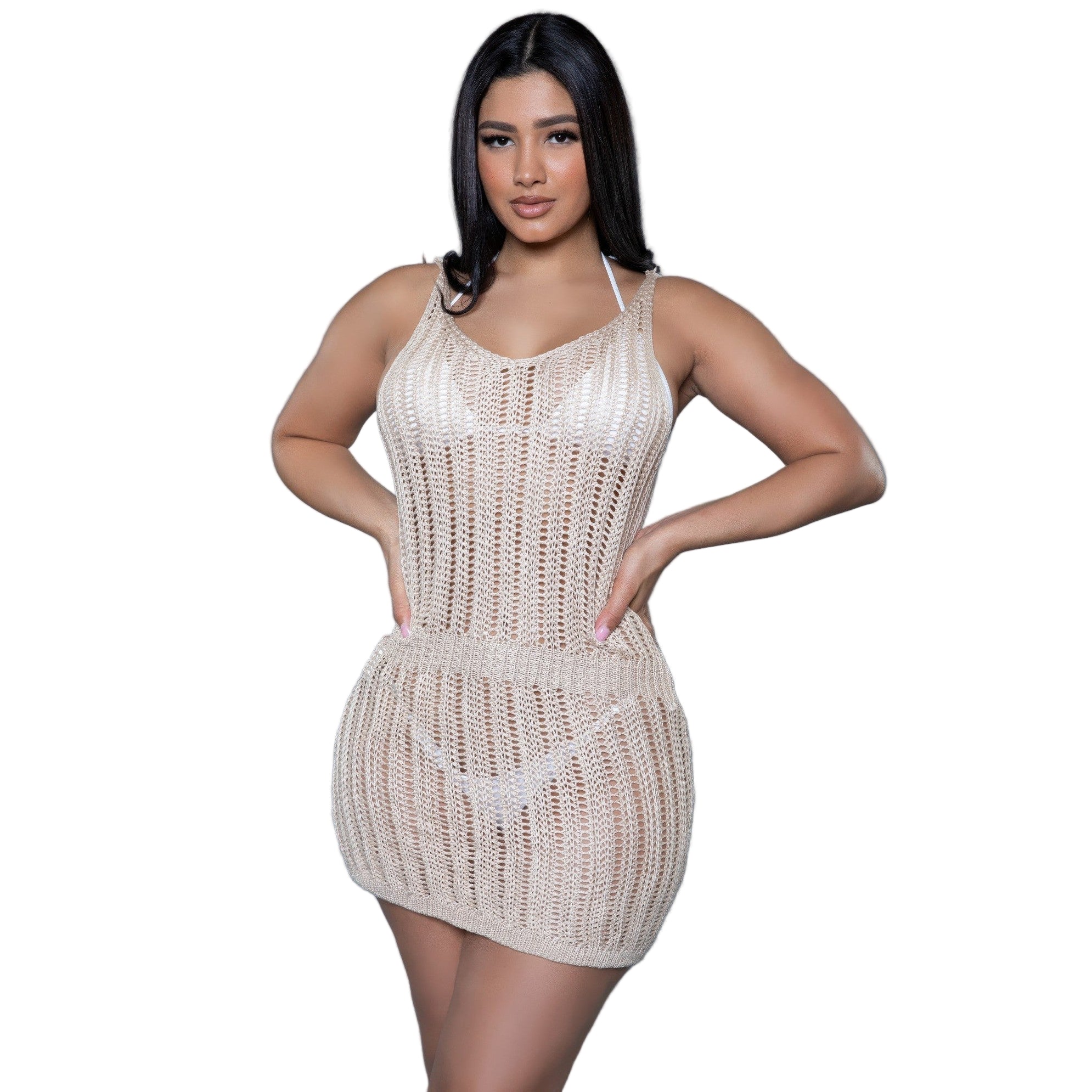 Make a stylish statement in the Josephine Crochet Mini Dress, the perfect beachside or poolside cover-up. Crafted from soft, breathable polyester, this dress features an intricate open-knit design that plays with transparency for a flirty yet refined look. The flattering V-neckline, sleeveless cut, and gathered waist create an effortlessly feminine silhouette, while the semi-sheer linear crochet pattern adds a touch of bohemian charm. Lightweight and easy to layer over your favorite swimwear, it’s an essential piece for sunny getaways or lounging in style.