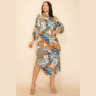 This dress stands out with its captivating print, versatile design, and thoughtful details like adjustable sleeves. It's the perfect blend of fashion and comfort.