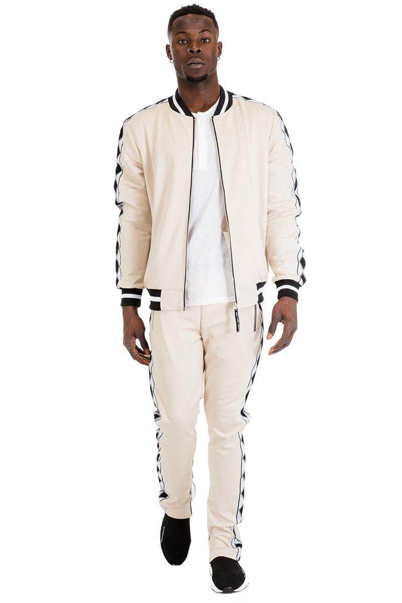 VacationGrabs Mens 2PC Track Set - Beige Black Stripe Track Pants