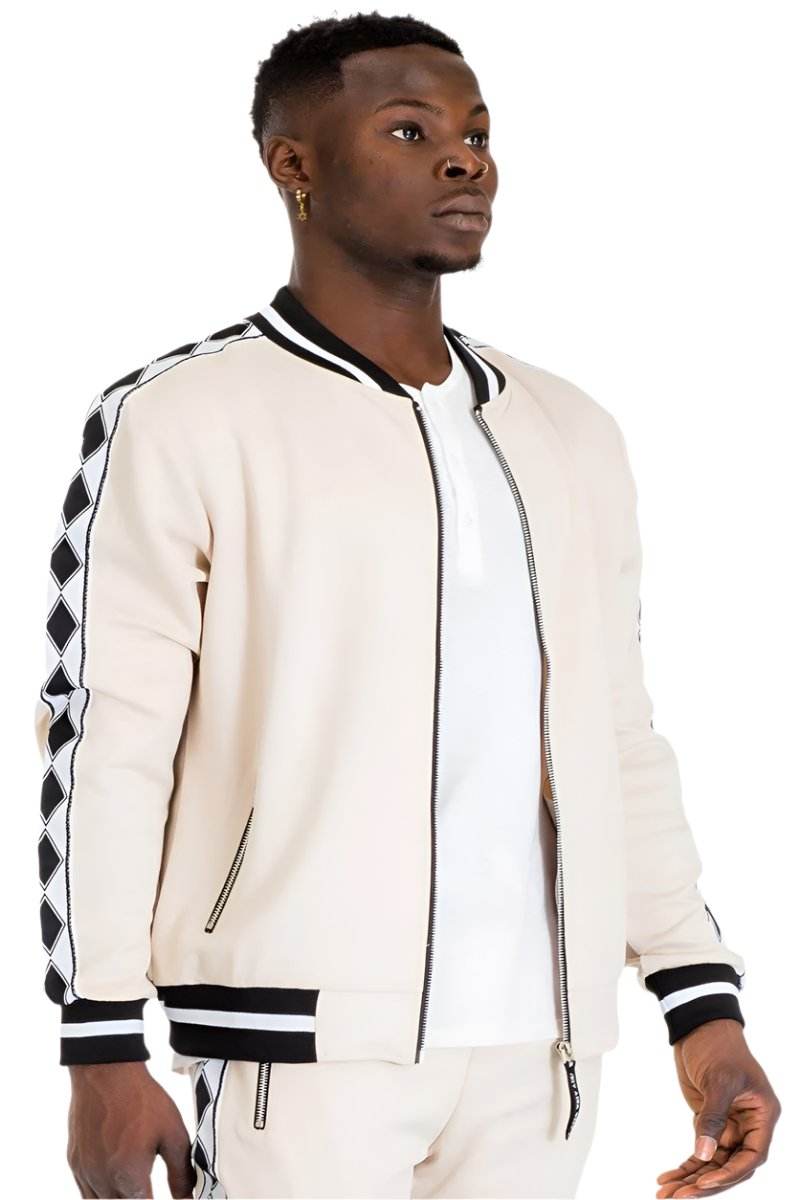 Experience ultimate comfort and style with the Men's Diamond Single Stripe Track Set in beige black. This outstanding set from VacationGrabs is perfect for those who love fashion-forward sportswear. Designed with attention to detail, it adds a touch of elegance to casual wear. The contrasting beige black stripe track pants elevate this outfit.