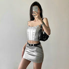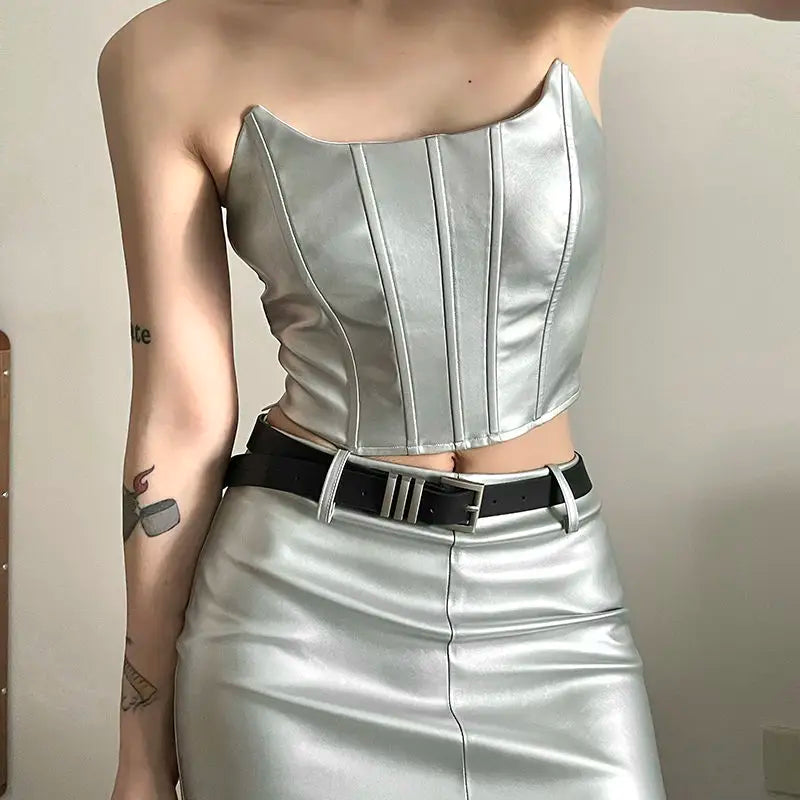 Shine in the spotlight with the womens metallic skirt and crop top set from VacationGrabs. This outfit includes a sleek skirt and a matching crop top. The fabric has a metallic finish. The cut is strapless. The style is perfect for nights out, festivals, or upscale clubs.