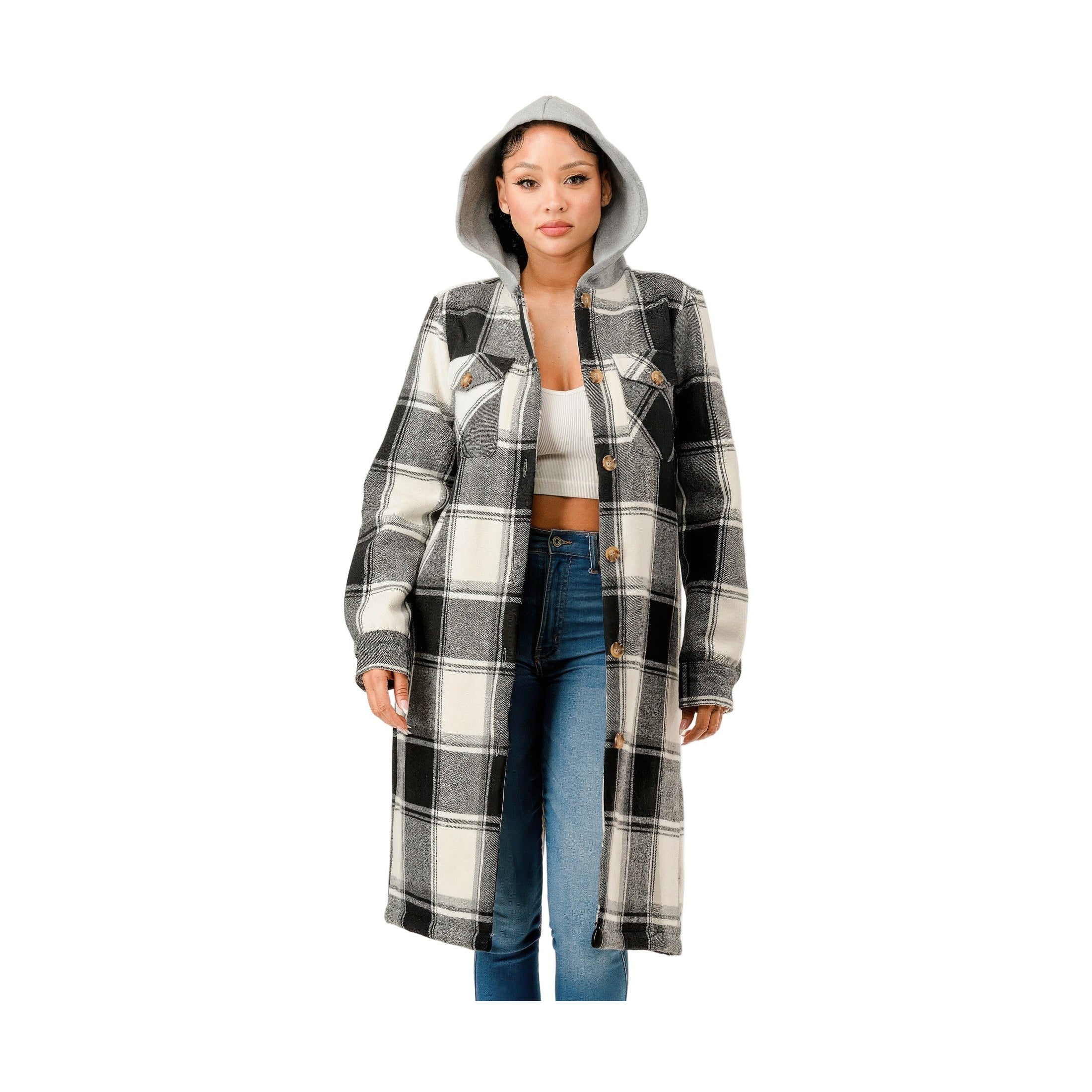 Layer up in timeless style with this hooded plaid coat, designed for warmth, comfort, and everyday versatility. Featuring a classic button-down front and roomy silhouette, this coat is perfect for cool-weather layering. The attached hood offers added protection from the elements, while functional front pockets add practical appeal. Made from a soft polyester-spandex blend, it delivers gentle stretch and ease of movement. Available in five rich plaid colorways and extended sizing, it's a staple piece that pairs effortlessly with everything from denim to leggings.