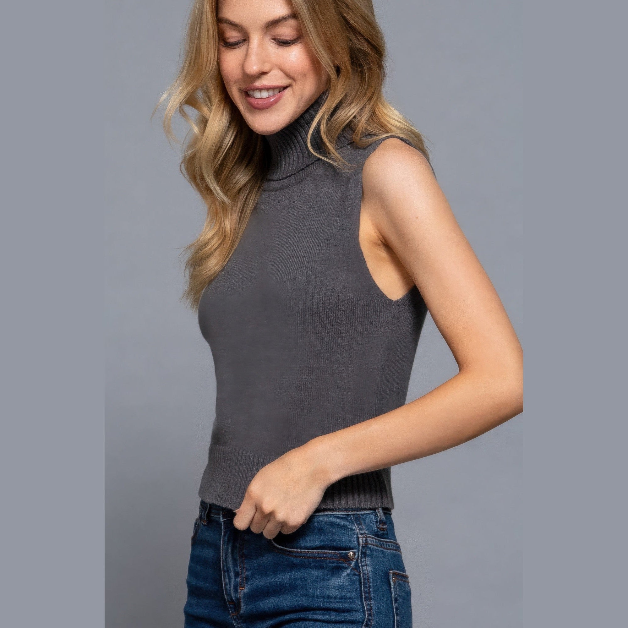 Get ready to turn heads and make a statement with our Sleeveless Turtle Neck Sweater Top. Add it to your cart now and experience the perfect blend of fashion and comfort!