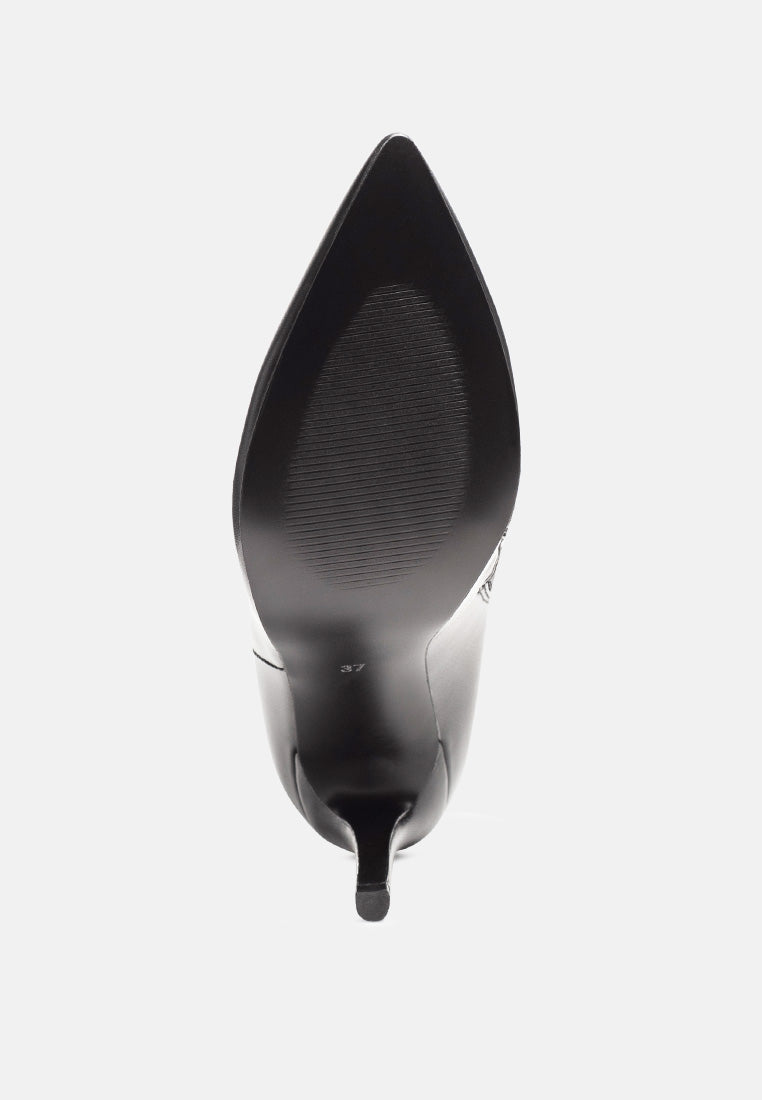 The boots are all jazzed up with with metal studs and chain embellishments which instantly elevate and cut through the monotony on the monochrome boots. The stiletto heel look sharp and sexy. These are the perfect accessory for a weding party as wedding heels, bridal shoes, after party shoes at a winter wedding!