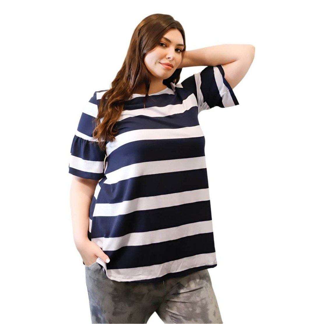 Introducing our Plus Stripe Bell Short Sleeve Top, a must-have addition to your wardrobe. Embrace style and comfort with this chic and trendy piece that effortlessly combines girlish charm with a relaxed fit. Perfect for casual occasions, this top features bell short sleeves, a round neckline, and a non-sheer, stretchy construction for maximum comfort.