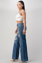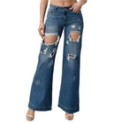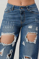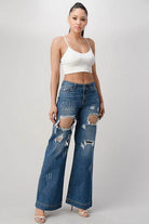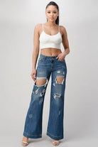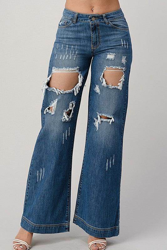 Step up your style game with the Medium Blue Distressed Wide Leg Boyfriend Jeans by LITZ LA. These women's jeans embody a perfect blend of comfort and chic design. Whether you're heading out for a casual day or elevating your vacation attire, these distressed denim pants fit the bill.