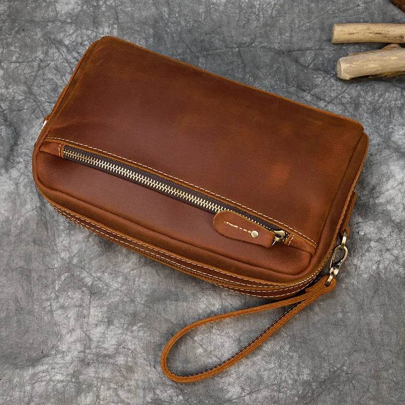 Stay stylish and organized with this Large Capacity Leather Hand Clutch. This versatile bag doubles as a makeup and storage bag, featuring a detachable shoulder strap, soft genuine leather, and a secure zipper closure. Available in chic shades of Dark Brown, Light Brown, and Black—perfect for unisex use.