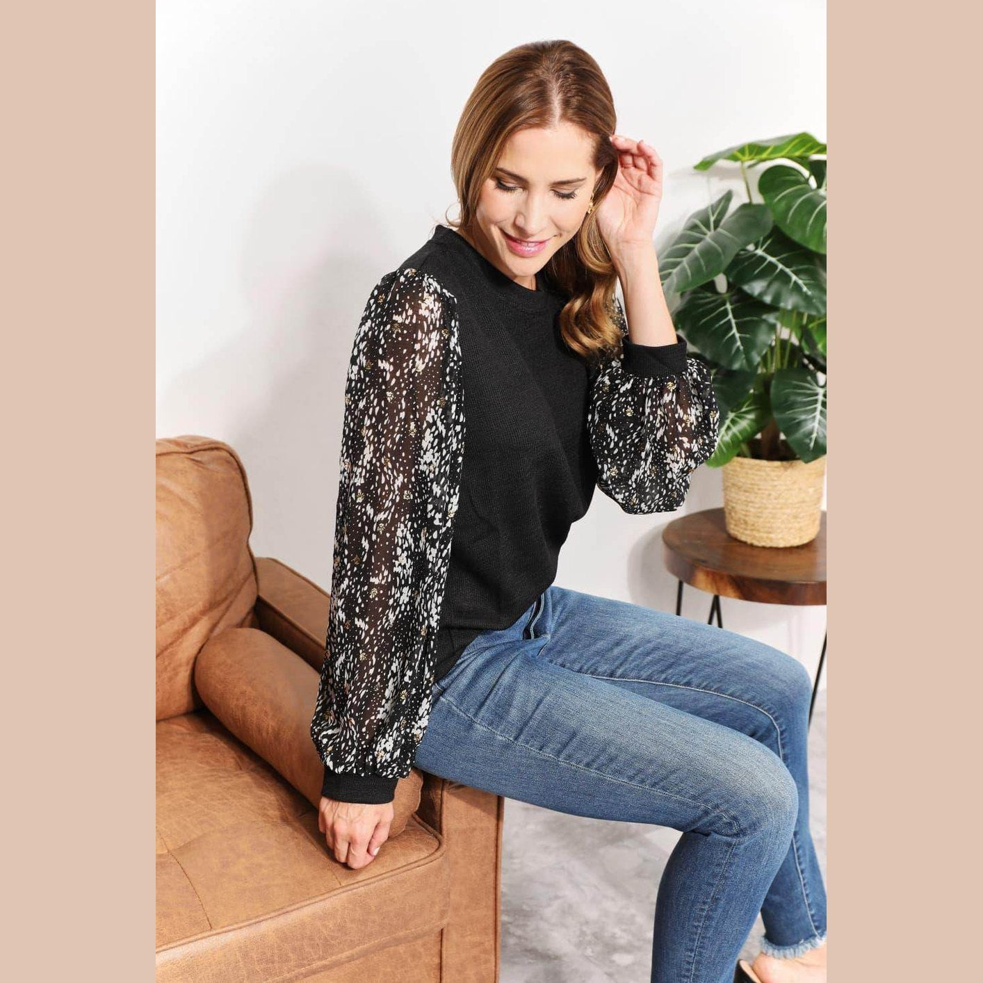 Learn more about our And The Why Full Size Foil Printed Sleeve Top at VacationGrabs: