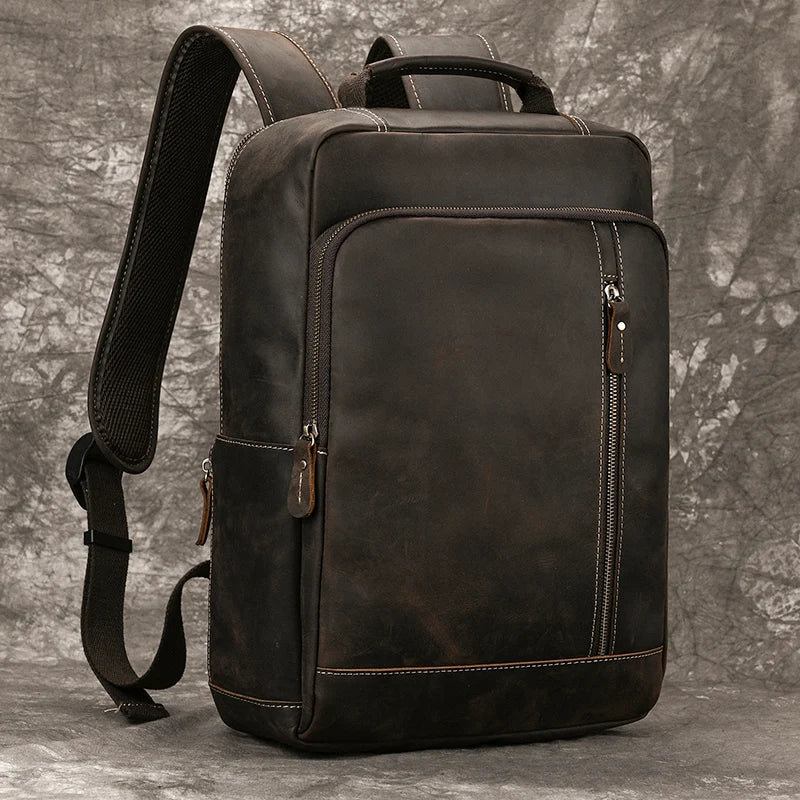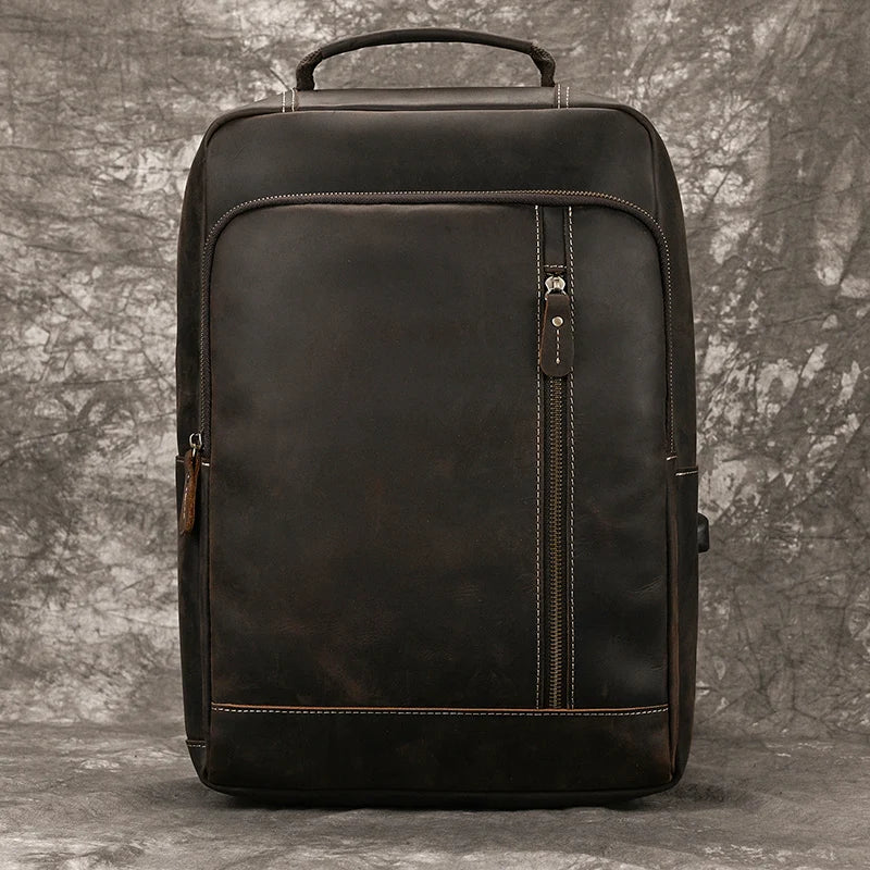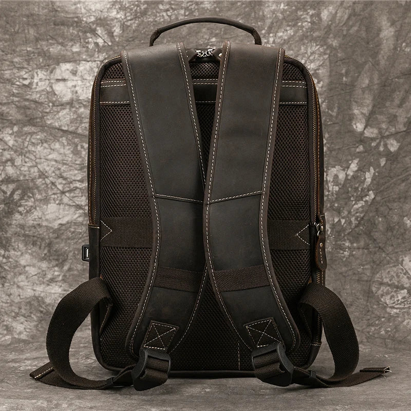 Men's Crazy Horse Leather Backpack 15.6" Laptop Daypack USB